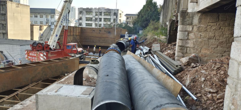 潤澤建設(shè)公司現(xiàn)場負(fù)責(zé)人曾張進(jìn)介紹:一水廠處于市區(qū),廠區(qū)內(nèi)空地小,施工場地受限,有些管道的安裝機(jī)械施展不開,只能靠人力來完成,比如DN500排泥管安裝在沉淀池底座的懸挑板下面,機(jī)械臂無法到達(dá),只能用起重葫蘆安裝,而DN800進(jìn)水管沿山邊支設(shè),管網(wǎng)開挖、鋪設(shè)難度也較大;同時,配套管網(wǎng)的安裝和沉淀池箱體的施工交叉施工,進(jìn)一步增加了施工難度。